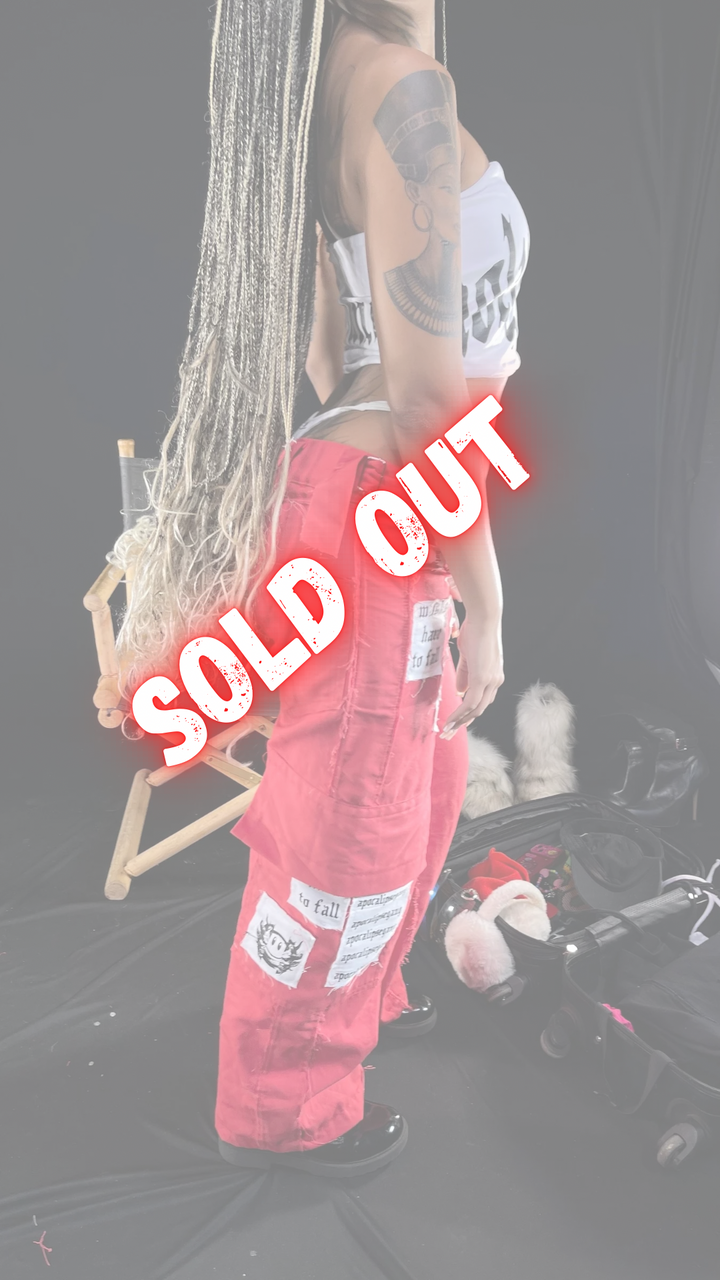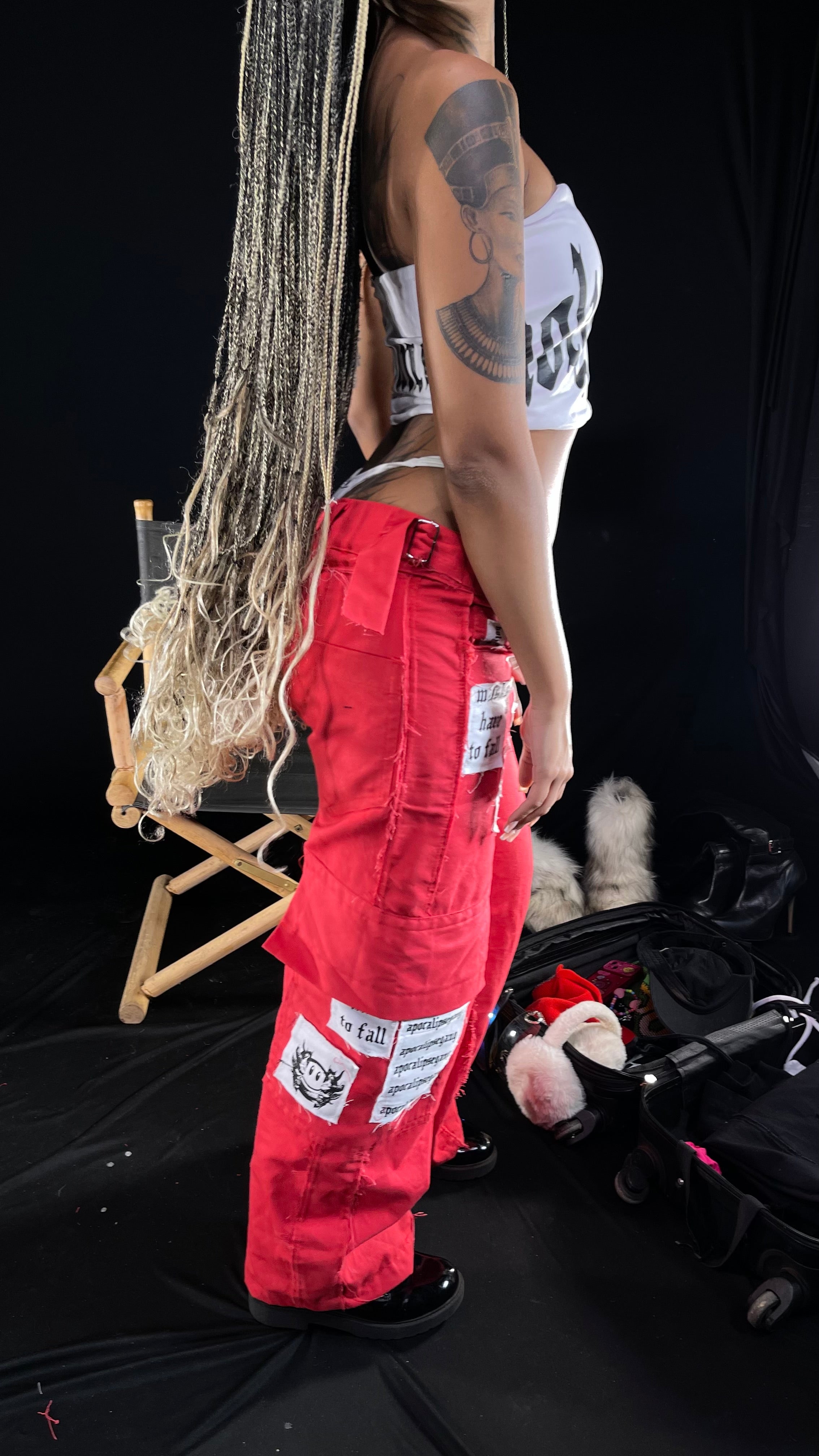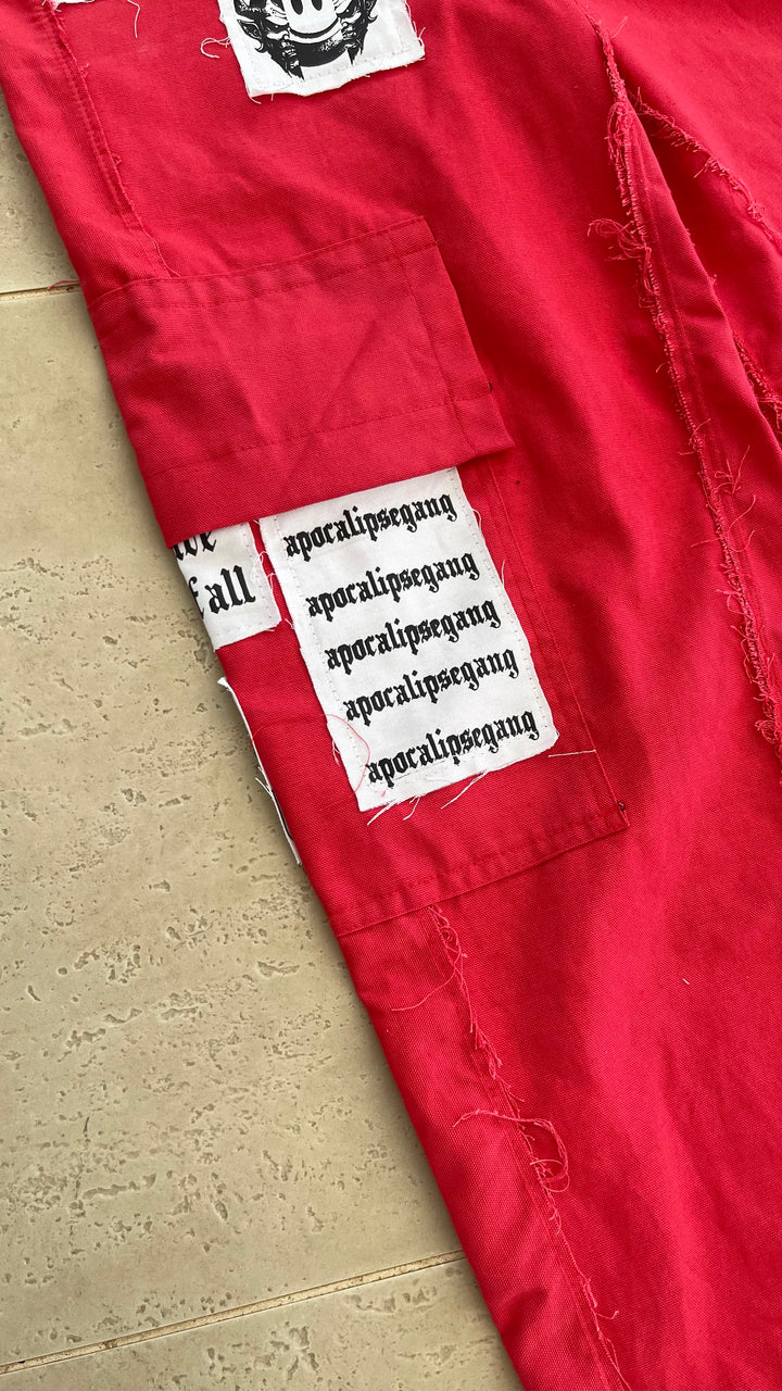 Produto: Calça com patches Cor: Vermelha Modelagem: Solta Cintura: Zíper e regulador Barra: Regulador Tecido: Sarja Acabamento: Embutido Composição: Algodão 100% reciclado Detalhe: Bolso Faca frontal, Bolso Cargo lateral e Bolso Básico traseiro Fabricante: Holygang *Na foto a modelo veste tamanho P Medidas: P:...