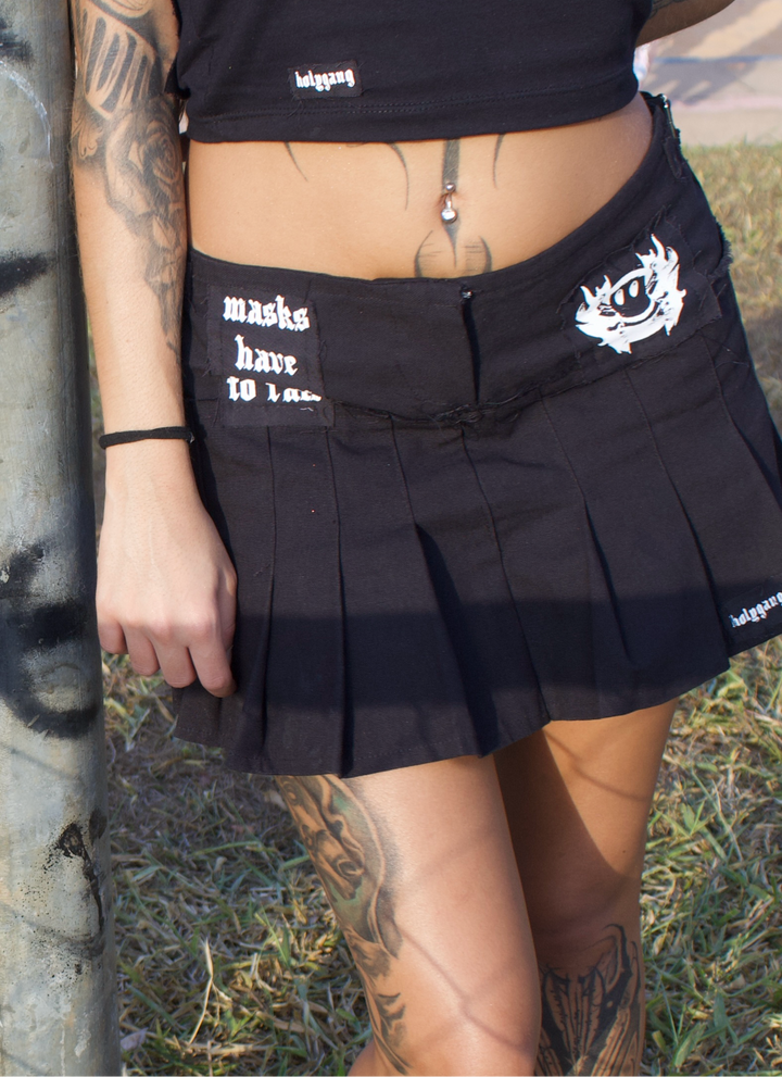 Produto: Mini saia Cor: Preto Modelagem: Solta Cintura baixa: zíper e regulador Tecido: Sarja Acabamento: Embutido Composição: Algodão 100% reciclado Detalhes: Pacthe Fabricante: Holygang *Na foto a modelo veste tamanho P Medidas: P: Comprimento 26 cm/ cintura (baixa) 88 cm M: Comprimento 30 cm/ cintura...